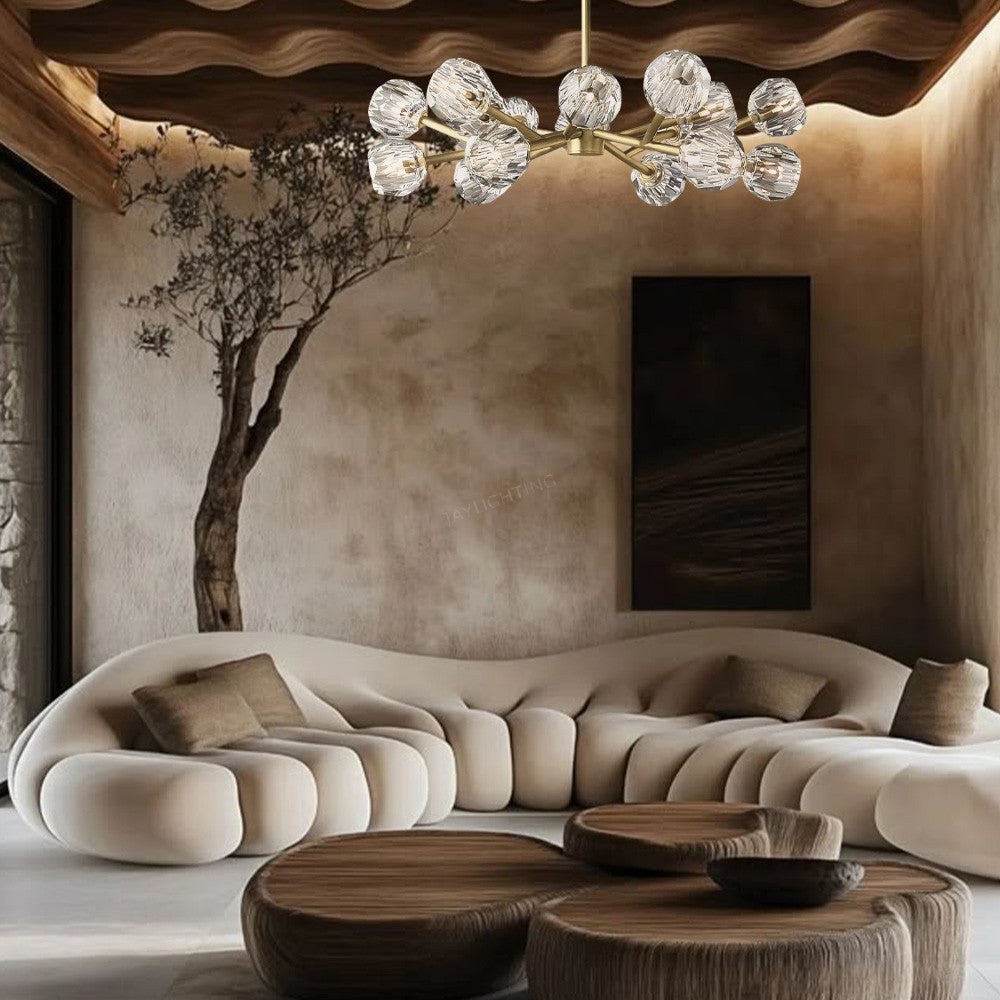| The collection crafted of solid brass and crystal glass, for luxe materials and superior craftsmanship, each finely faceted sphere is ground and polished by hand to reflect and refract the light. |