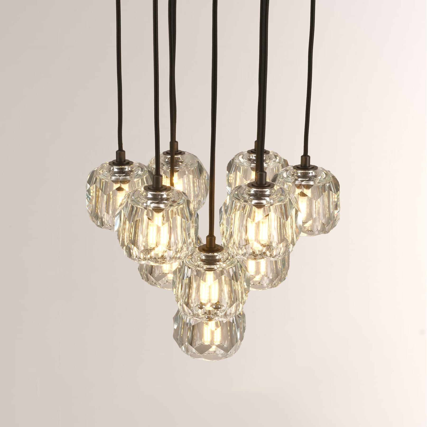 | The collection crafted of solid brass and crystal glass, for luxe materials and superior craftsmanship, each finely faceted sphere is ground and polished by hand to reflect and refract the light. |