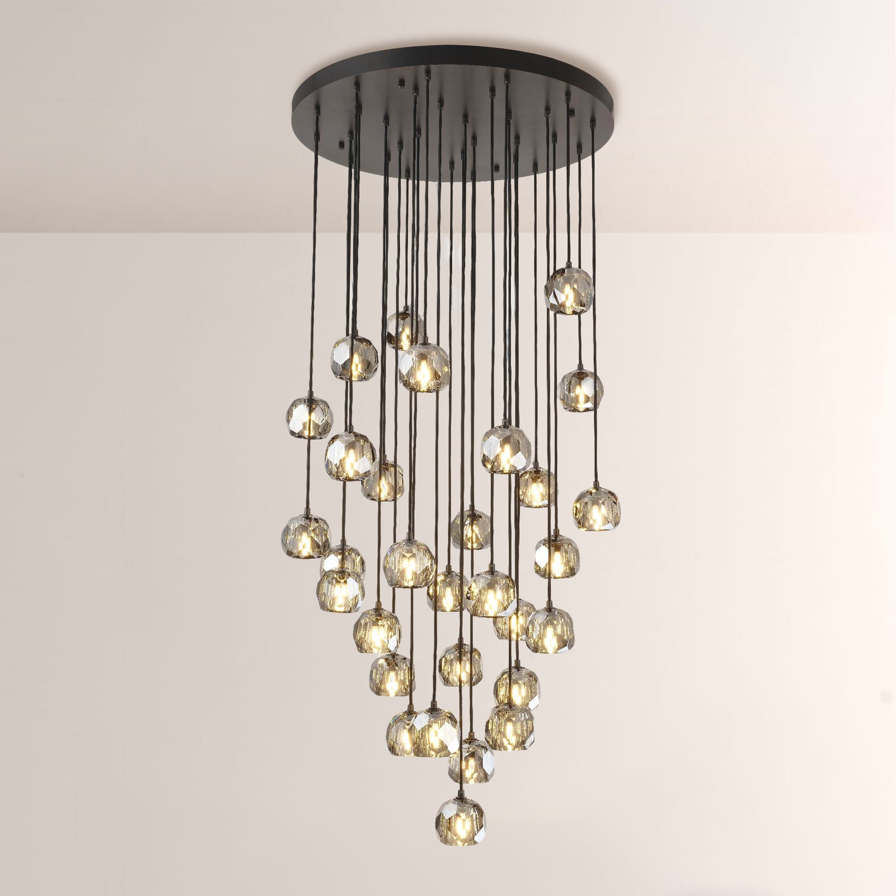 | The collection crafted of solid brass and crystal glass, for luxe materials and superior craftsmanship, each finely faceted sphere is ground and polished by hand to reflect and refract the light. |