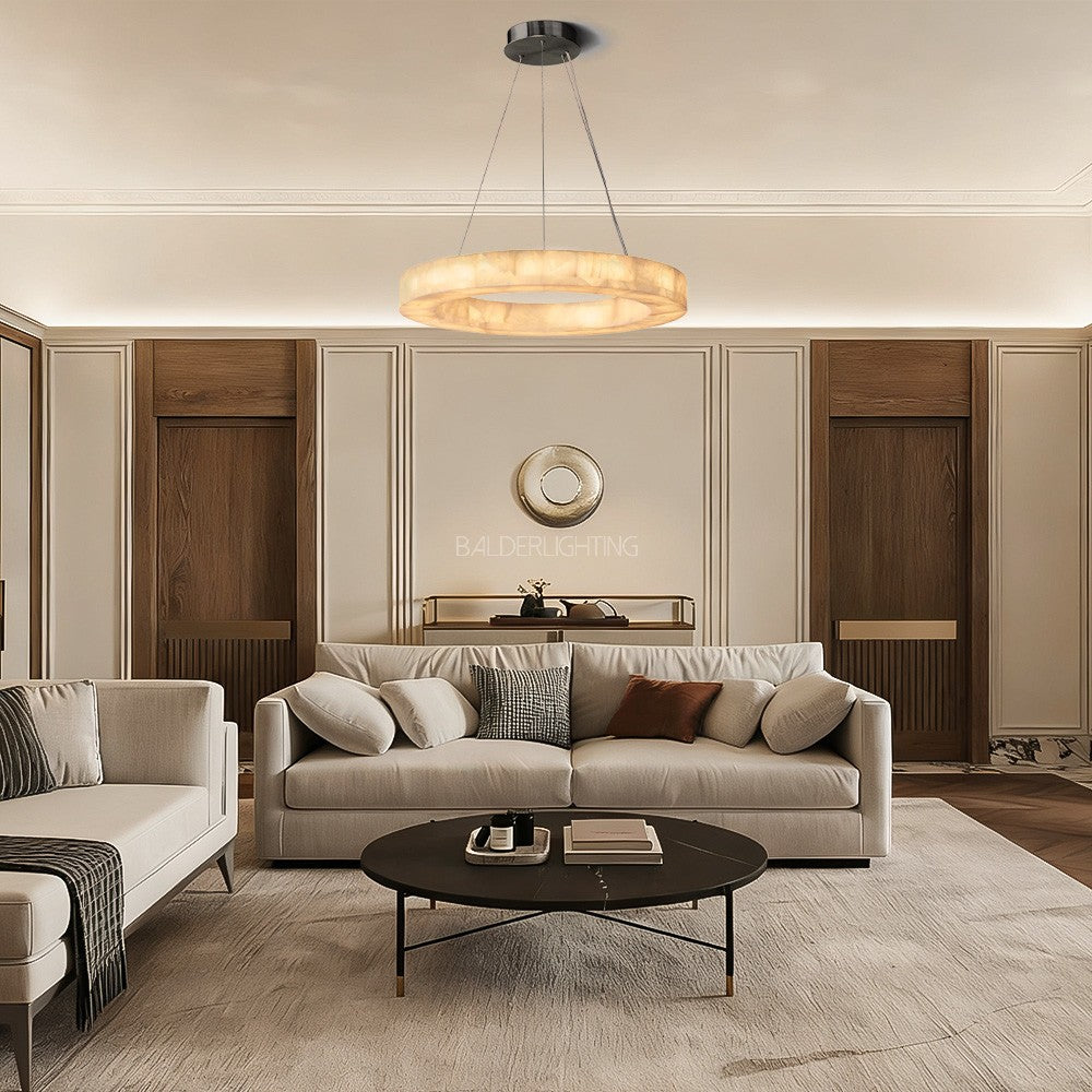 A collection of chandelier with minimal shapes and striking effects, highlighting the beauty of calcite, a translucent stone that radiates a warm, natural glow. Halos of polished stone are suspended from slender steel cables, artfully stitched together to create a smooth, continuous surface, while subtle lighting inside accentuates the organic colors and textures. Each luminaire is a unique statement.