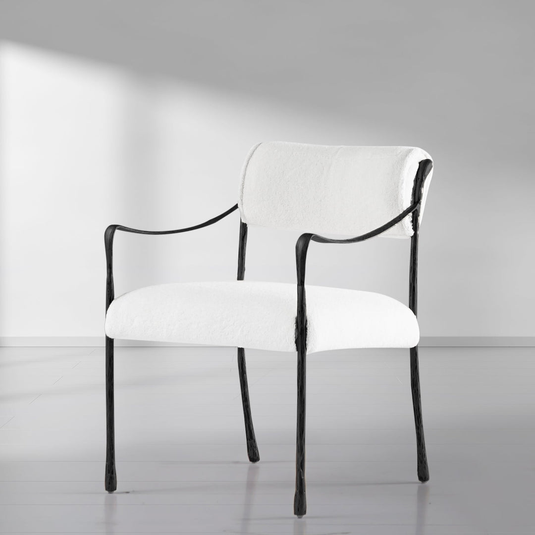 Our chair from the rustic sensibility of a hand-forged metal base with tailored upholstery. Employing an ancient fabrication process, artisans hand hammer the metal bars to reveal an alive, imperfect and organic texture, a counterpoint to the frame's slender, tapered silhouette.