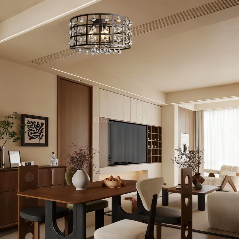 Industrial chic meets modern flair in this eye-catching flush-mount light. Crafted in Italy, this fixture’s iron cage frame with antiqued patina is inspired by vintage factory lighting. Glass crystal spheres add unexpected glamour.