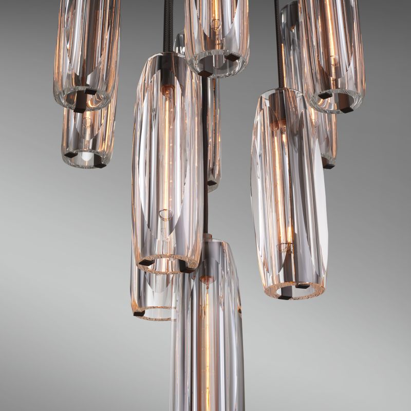 The Osleride 10 Light Circular Chandelier is made up of ten lead crystal  Pendants. The ceiling plate and socket covers are made by hand. All parts are hand polished and patina’d.Dimensions:
